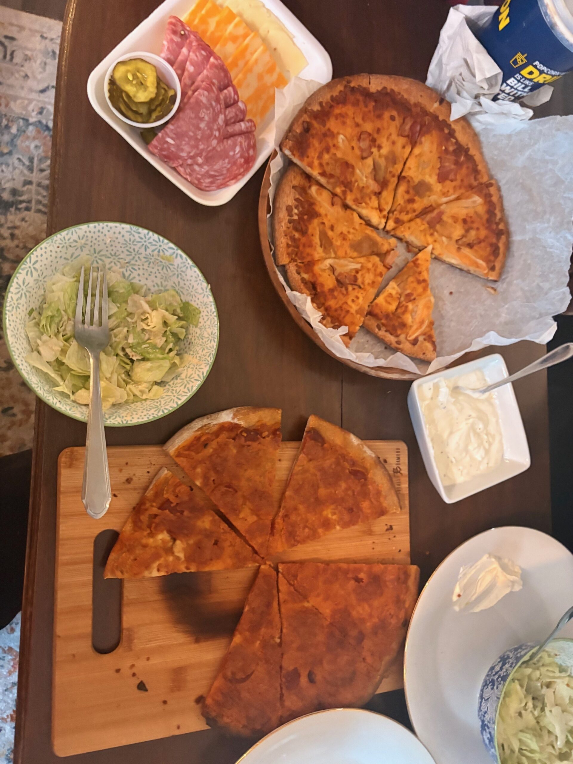 Just an air mattress, cozy blankets, pizza, a “we tried to be healthy” salad, and enough snacks to sustain us through at least three emotional breakdowns or one mediocre movie.