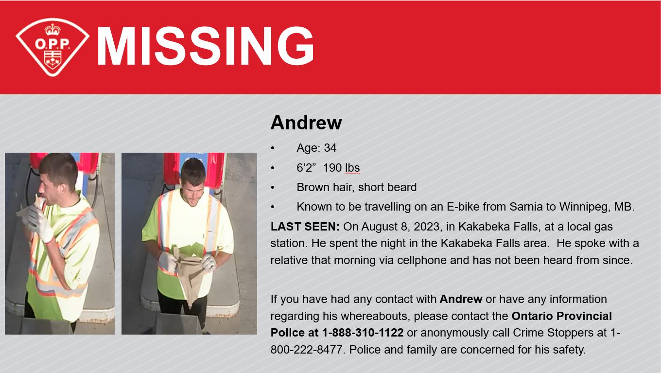 The OPP are looking for Andrew, who is described as 6 feet, 2 inches tall, muscular build, with hazel eyes, short brown hair and a short beard.