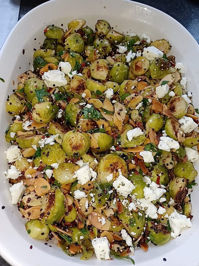 Toss the warm roasted Brussels sprouts with the topping so the flavours meld and the cheese softens just a touch. The heat wakes up the chilis, the herbs stay fresh, and the crunch stays… well, crunchy.