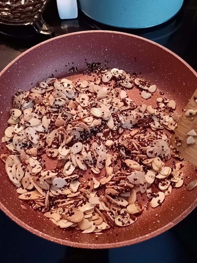 Toast everything lightly in a pan on the stovetop. The almonds get golden, the quinoa pops, and suddenly your kitchen smells like you’re doing something fancy.